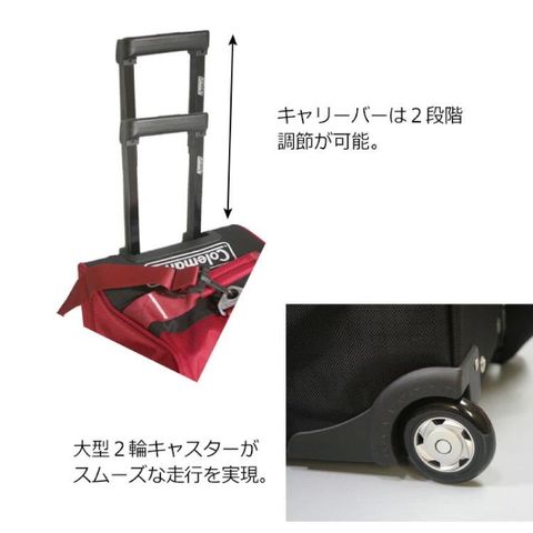 スムーズに動く大型の2輪キャスターが快適な走行を提供。キャリーバーは2段階の調整が可能。