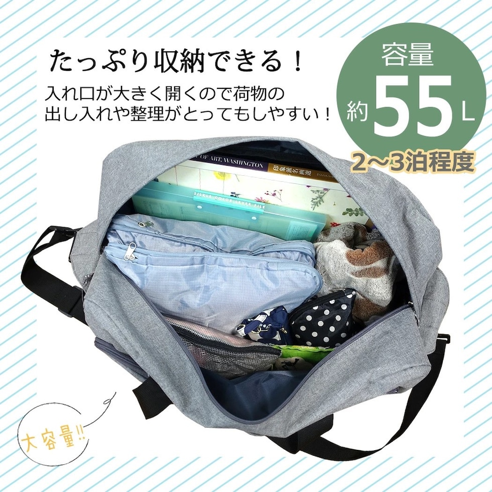 横幅約60cm、容量約55Lまで収容可能な、普段使いや2-3泊程度の旅行にピッタリのボストンバッグです。