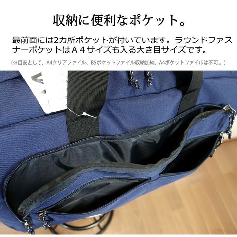 前面のポケットにはB5フラットファイルも入る大きなポケットが付いています。