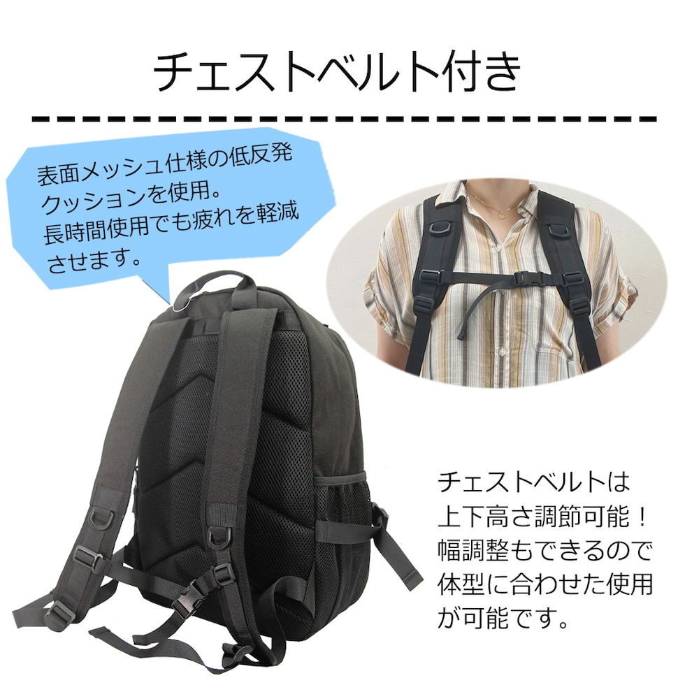 リュックストラップにはチェストベルトを備えているので、荷物が増えても安定して背負うことができるのもポイント。