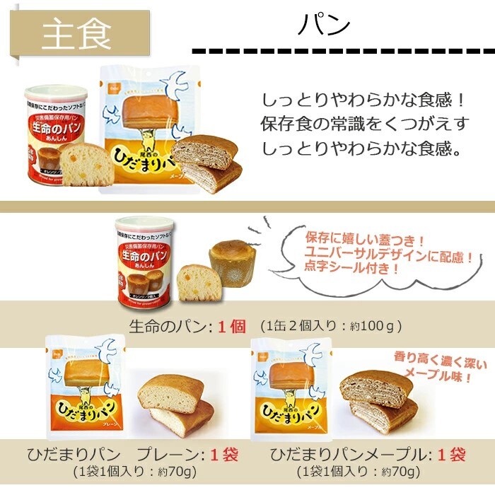 パンもふんわりおいしく、避難先で心が安らぐクラッカーなどのおやつも入っています。