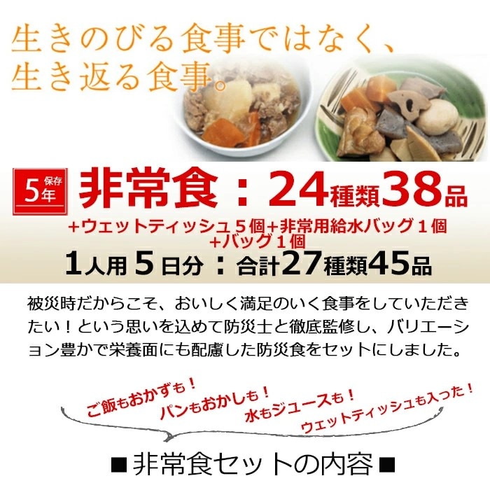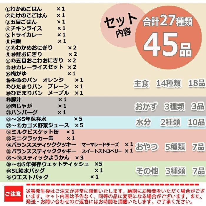 非常食 セット 中身だけ 45点セット 5日分 パン アルファ米 おかず お菓子 非常食・保存食 ウエストバッグ 水 防災 災害 coco壱 ごはん おにぎり 5年保存 給水バッグ 詰め替え用 備蓄用 防災グッズ 地震 キャンプ アウトドア 防災セット