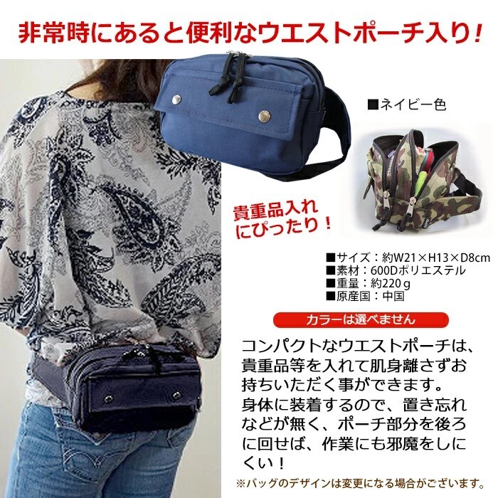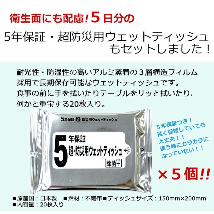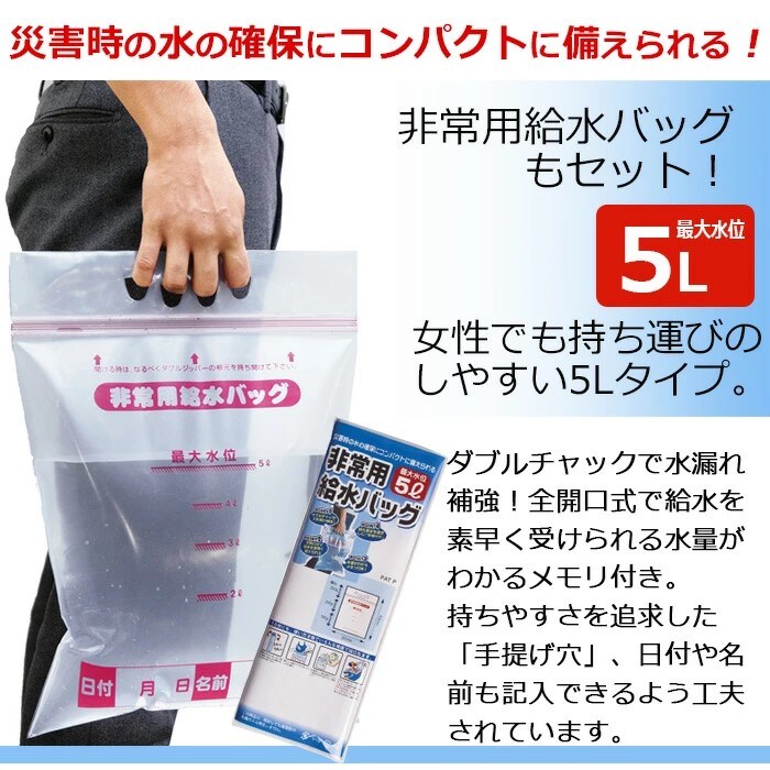 長期保存にも耐える5年保証ウェットティッシュ、5Lの給水バッグ、貴重品入れに便利なウエストバッグ付きです。