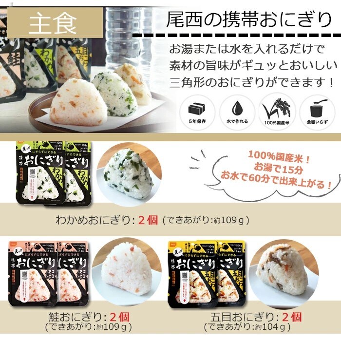アルファ米、ごはん、おにぎりは、お湯で約15分、水で約60分でおいしいごはんが出来上がり。
