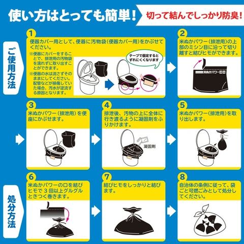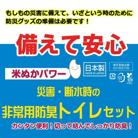●米ぬかを使用した防臭機能に優れたバイオマスポリ袋と、抗菌・消臭 簡易トイレ用凝固剤で、臭いを防ぎます!
