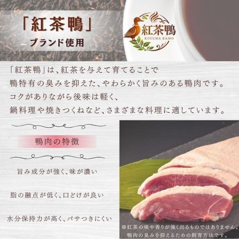 | 原材料 | あい鴨肉、長ねぎ、コーンスターチ、砂糖、食塩、しょうゆ(小 麦・大豆を含む)、大豆たん白、香辛料、紅茶/調味料(アミノ 酸)、ポリリン酸Na |