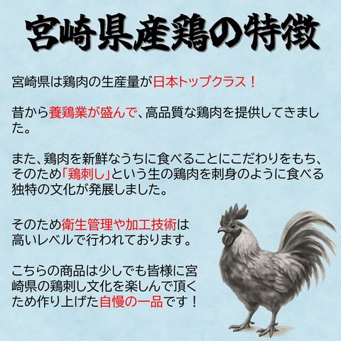 新鮮な宮崎県産の若鶏を手作業で捌いて湯煎後、氷水でしめて急速冷凍しました。