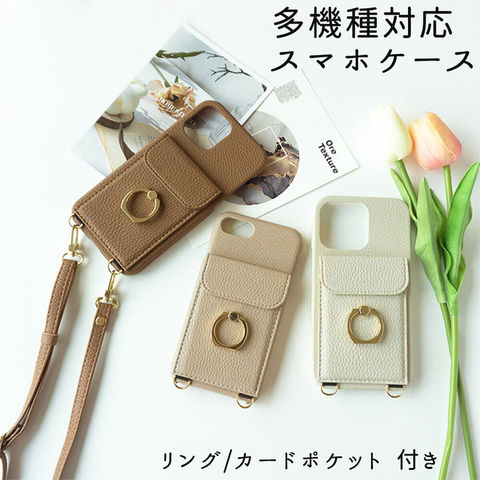 多機種対応 スマホケース ショルダーストラップ付 【 リング付き マグネットポケット スマホケース 】 カードポケット ベージュ Google Pixel 8a