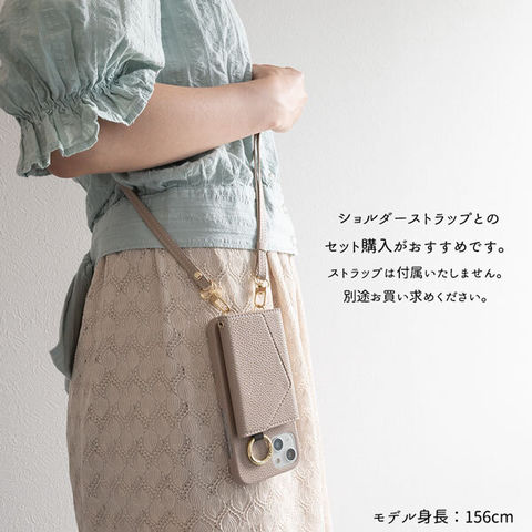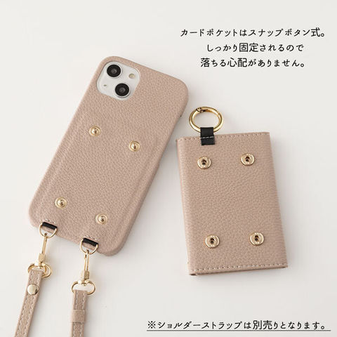 取り外し可能なカードポーチが付いたストラップを装着できるタイプのスマホケースです。
