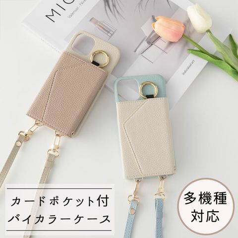 スマホショルダー 多機種対応【 付け替え ミラー カードポケット スマホケース バイカラー 】 ベージュ Google Pixel 8a