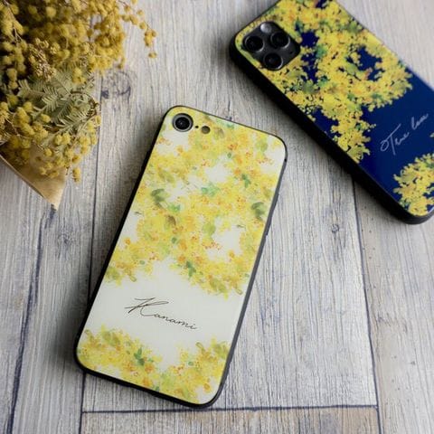 多機種対応 スマホケース ガラス【 ミモザ 名入れ 】 花 文字入れ アイボリー iPhoneXR