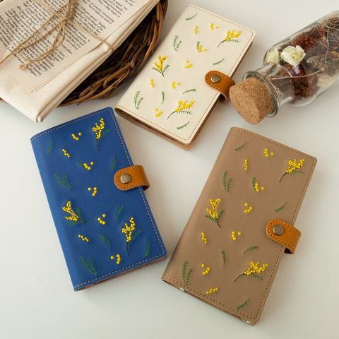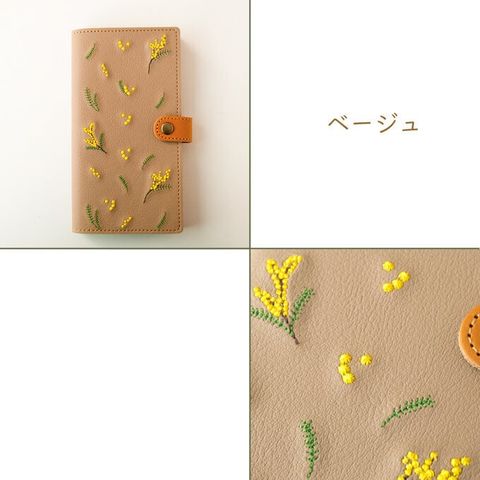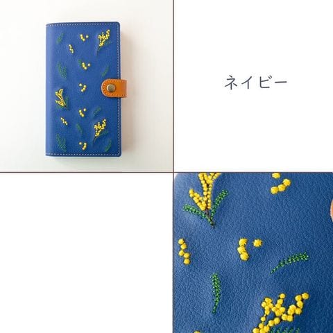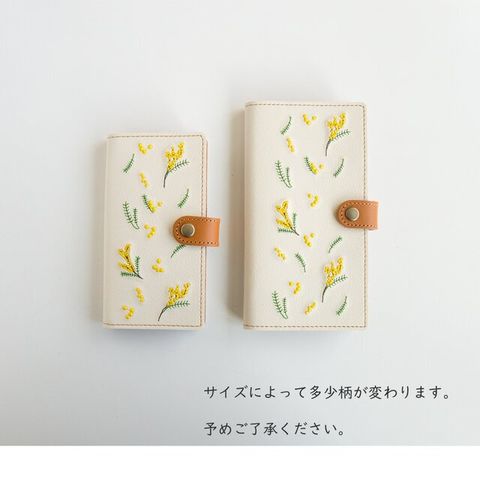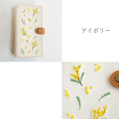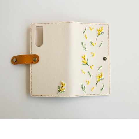 人気のミモザの刺繍を施した手帳型スマホケースです。