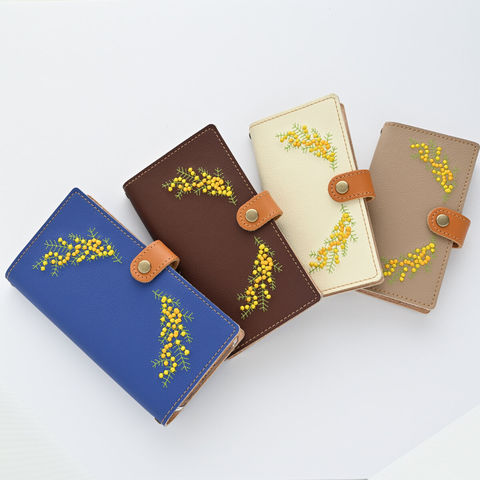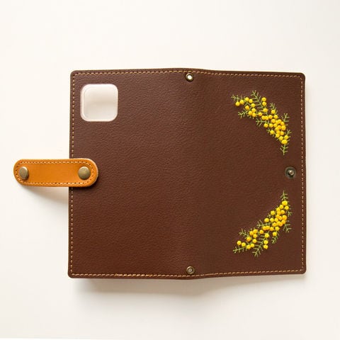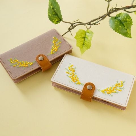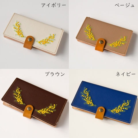 4色それぞれにミモザがパッと映える横向きのスマホケースです。
