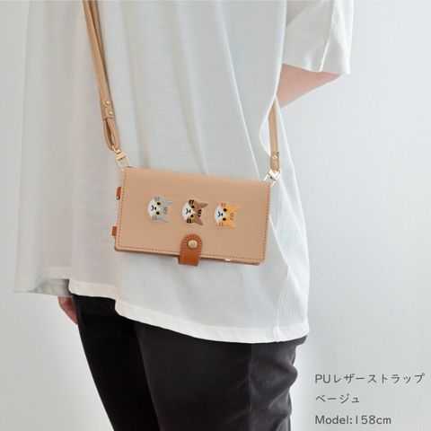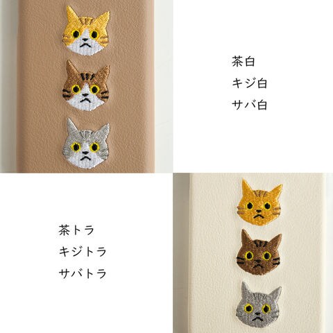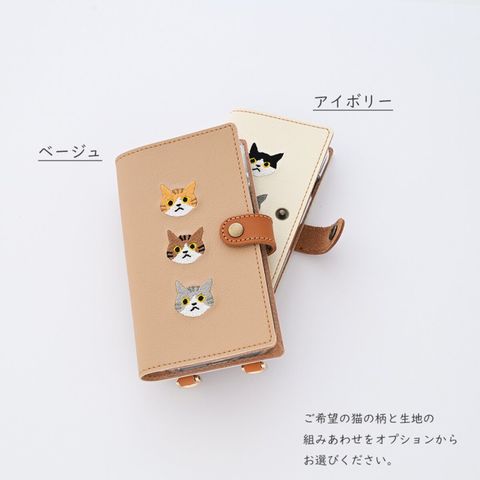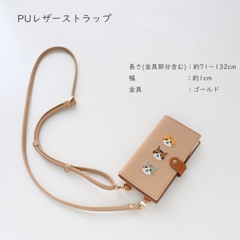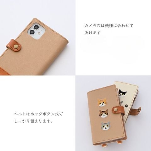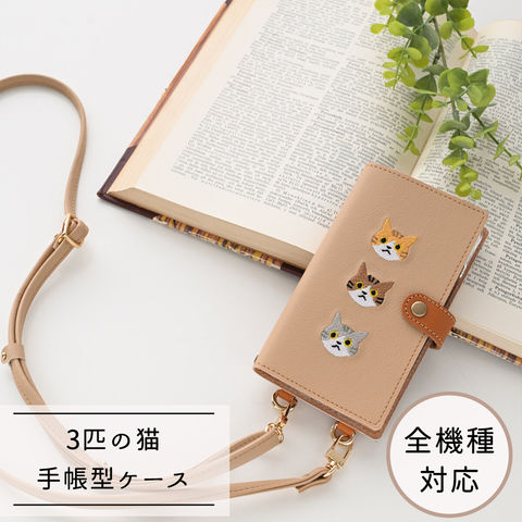 多機種対応 スマホケース 手帳型 ストラップ付 【 刺繍 縦下げパーツ 3匹の猫 】 ベージュ Galaxy S24