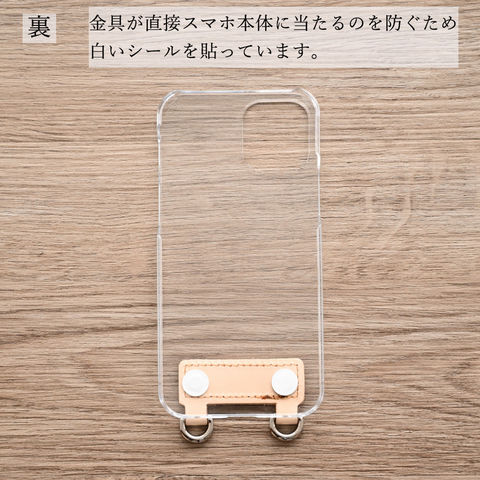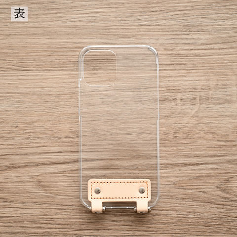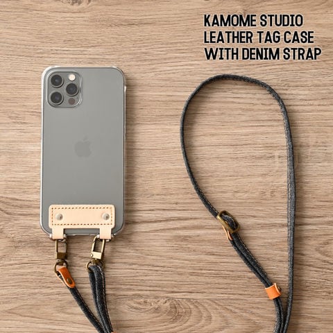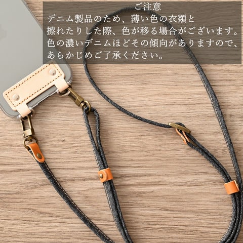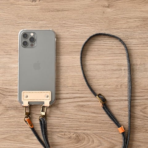 クリアのスマホケースとデニムを使用した長さ調整可能なストラップです。