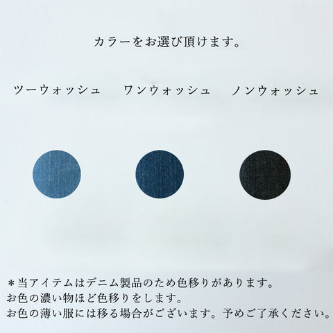 *デニム製品ですので、水濡れや汗、蒸れた状態でのご使用はお気を付けください。色移り等の原因となる可能性があります。