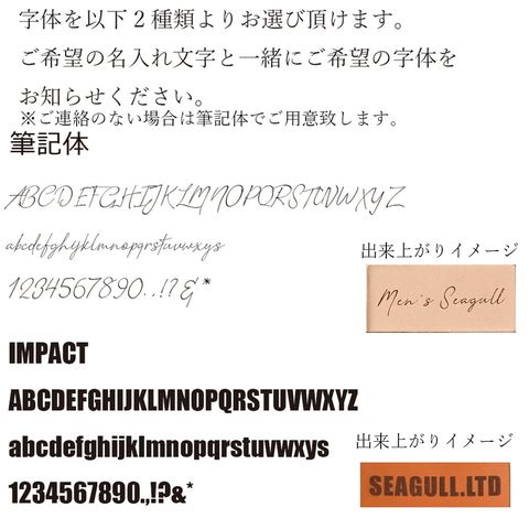 ・ご購入の際に、備考欄に入れる「●字体(筆記体または、IMPACT)」と「●文字の記入」をお願いいたします。