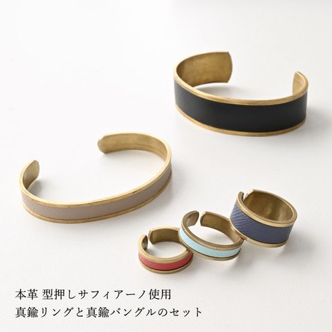 真鍮リング 真鍮バングル セット 【 型押しサフィアーノ 】ブラス 本革 姫路レザー ペアリング ペア アクセサリー ブレスレット メンズ プレゼント ギフト 贈り物 誕生日 記念日 アイスブルー