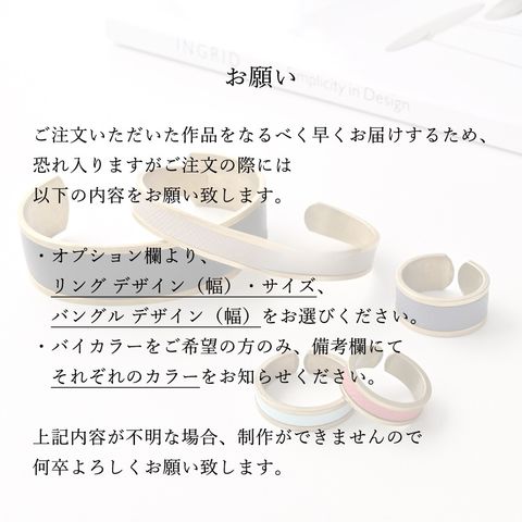 *備考欄より必ず【リング デザイン(幅)・サイズ】【バングル デザイン(幅)】をご記入ください。