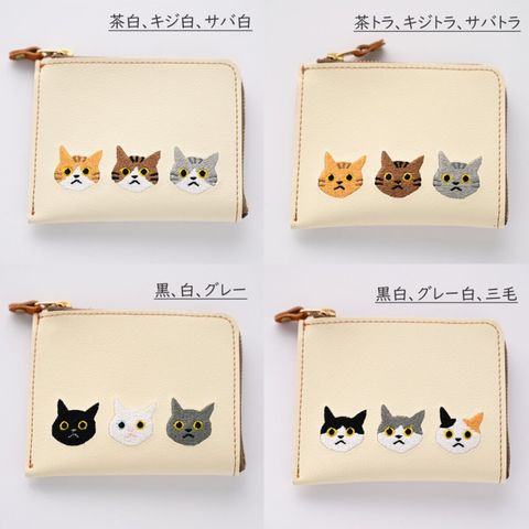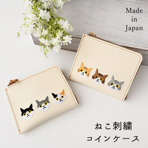 コインケース 【 刺繍 3匹の猫 】 レザー コンパクト 黒、白、グレー