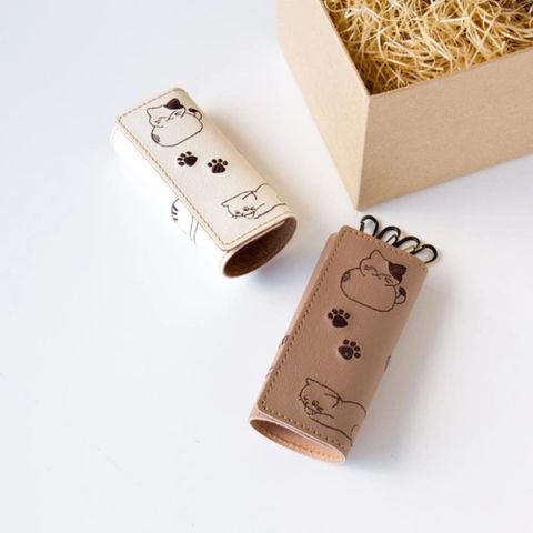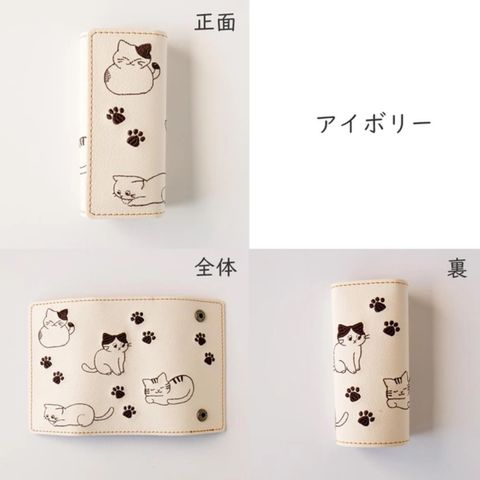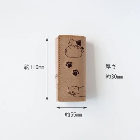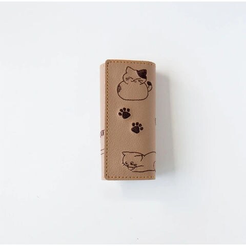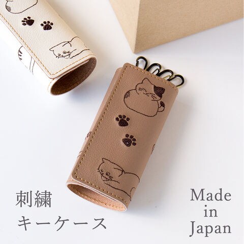 【 国産 PU レザー 】 キーケース < 刺繍 猫 ステッチ> 日本製 動物 プレゼント ギフト ベージュ