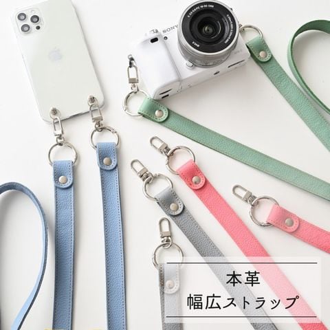 幅広ストラップ 【 シュリンクレザー 】 ショルダーストラップ スマホショルダー カメラストラップ アクアブルー 金具 ゴールド