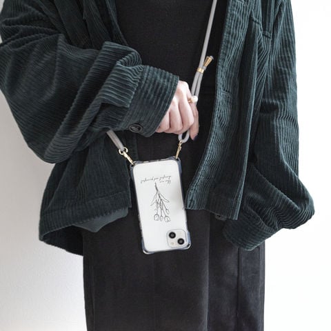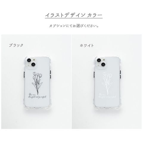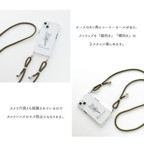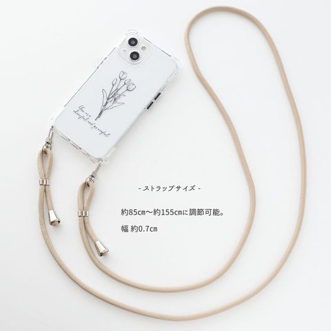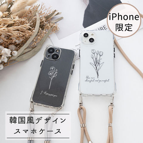 スマホショルダー HMストラップ付 【 TPUクリアケース デザイン - flower ‐ 】 スマホケース クリア クリアケース 花 花デザイン 韓国風 韓国 線画 スマホストラップ 誕生日 記念日 贈り物 ギフト プレゼント 新生活 文字カラー ホワイト iPhone14 Pro Max