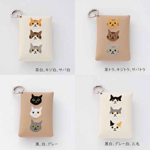 マルチポーチ 【 刺繍 3匹の猫 】 カード収納 小物入れ ポーチ 猫 猫の日 茶白 ハチワレ 黒猫 誕生日 記念日 贈り物 ギフト プレゼント プチギフト アイボリー 黒白、グレー白、三毛