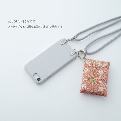 カラビナ付きでバッグやスマホショルダーなどに通せば便利にお使いいただけます。