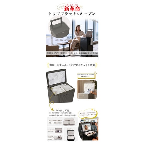 耐久性に優れたボディ、静音キャスター、TSAロックなど、本格的なトラベル機能を搭載しながら、 自宅では収納ボックスやサイドテーブルとしても使用可能。