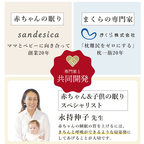 | 保護者の方の目の届く範囲でご使用下さいますようお願い致します。 赤ちゃんに枕が必要か、使用時期、どんな枕が良いかには様々な見解がございます。 当製品は「赤ちゃんの眠りの質をより高めたい」という想いのもと企画しております。 当製品を使用することにより、向き癖や絶壁対策としての効果をお約束するものではございません。 また、使用時期や使用方法については、赤ちゃんの様子、成長に合わせて、保護者の方のご判断でお願いいたします。 |