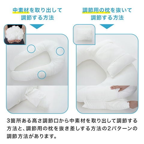 3箇所ある高さ調節口から中素材を取り出して調節する方法と、調節用の枕を抜き差しする方法の2パターンの調節方法があります。