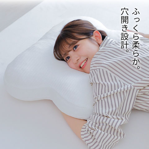 また、顔を真下に向ける"完全うつぶせ姿勢"でも顔がつぶれたり、呼吸を妨げたりしないよう、中央部分に穴があいています。顔を横に向ける際はには耳がつぶれにくい設計です。