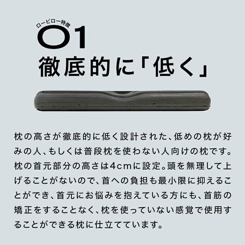 Low PilLow(ローピロー)は、低めの枕が好みの人向けの枕で、枕の高さを徹底的に低く仕立てました。また、枕の中素材に頭の形を象った低反発ウレタンを使用することにより、低さを保ちながらも、しっかりとした支えと底つき感のない寝心地を実現しました。