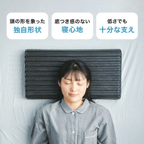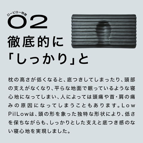 枕の高さが低くなると、底つきしてしまったり、頭部の支えがなくなり、平らな地面で眠っているような寝心地になってしまい、人によっては、頭痛や首・肩の痛みの原因になってしまうこともあります。Low PilLowは、頭の形を象った独特な形状により、低さを保ちながらも、しっかりとした支えと底つき感のない寝心地を実現しました。
