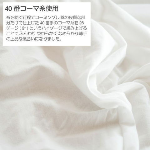 糸を紡ぐ行程でコーミングし綿の良質な部分だけで仕上げた40番手のコーマ糸を28ゲージ(針)というハイゲージで編み上げることでふんわりやわらかくなめらかな薄手の上品な風合いになりました。