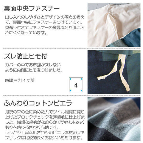 | 裏面中央ファスナー式、四隅ズレ防止ひも付き |
