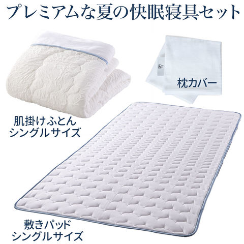 夏の火照った身体の熱をサーッと逃がし、寝汗をすっと吸い取ってくれて、べたべたとしない。プレミアムな夏の快眠寝具セット(肌掛けふとん+敷きパッド+枕カバー)です。