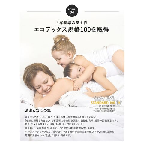 エコテックス(OEKO-TEX)とは、「人体に有害な薬品を使っていない」「健康に影響を与えない」など品質の安全性を保障する繊維、布地、編物の国際基準です。日本、アメリカ等を含む世界21ヶ国以上が加盟しているエコロジー認証基準の「エコテックス規格100」を取得しているので、ホルムアルデヒドや発がん性の疑いのある染料等を安全基準値以下で、廃棄した際も環境に無害な「人と環境」に優しい商品です。