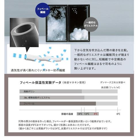 短繊維で中が空洞になっているため、空気を中まで取り込んであたたかく、ふんわり柔らかいのが特徴のトレビラフィルフィベール。羽毛に負けないほど軽く、いやな臭いもありません。 特殊加工を施した繊維トレビラ・フィル・フィベールは1本1本の繊維がストローのように空洞になっており、体温によって温められた空気を中に取り込むことで高い保温性を実現、冬でもあたたかく快適な睡眠を約束します。