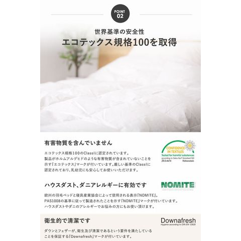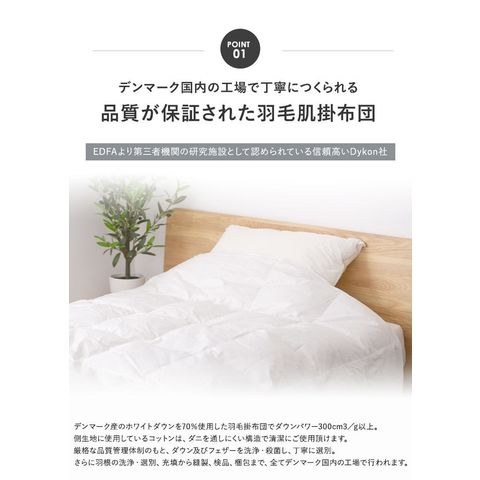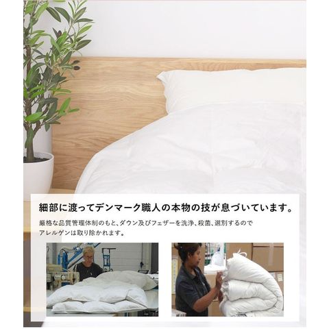 デンマーク国内の工場で丁寧につくられた羽毛掛け布団欧州産のホワイトダックダウンを85%使用した羽毛掛布団でダウンパワー350cm3/g以上。側生地に使用しているコットンは、ダニを通しにくい構造で清潔にご使用頂けます。厳格な品質管理の体制のもと、ダウン及びフェザーを洗浄・殺菌し、丁寧に選別。さらに羽根の洗浄・選別・充填から縫製、検品、梱包まで、全てデンマーク国内の工場で行われます。 ![]() ![]() ![]() ![]() ![]() ![]() 世界基準の安全性 エコテックス規格を取得エコテックス(OEKO-TEX)とは、「人体に有害な薬品を使っていない」「健康に影響を与えない」など品質の安全性を保障する繊維、布地、編物の国際基準です。日本、アメリカ等を含む世界21ヶ国以上が加盟しているエコロジー認証基準の「エコテックス規格100」を取得しているので、ホルムアルデヒドや発がん性の疑いのある染料等を安全基準値以下で、廃棄した際も環境に無害な「人と環境」に優しい商品です。 ![]() ![]() ![]() |