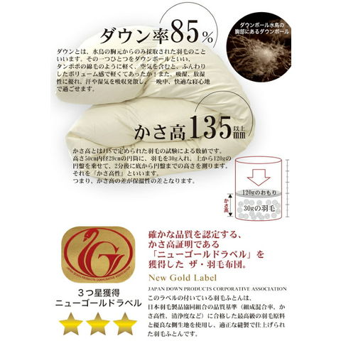 ザ・羽毛布団 ニューゴールドラベル 羽毛布団 シングルサイズ 約150×210cm ホワイトダックダウン85% 詰め物重さ:1.1kg、かさ高:13.5cm 羽毛 軽い 軽量 暖かい あったか