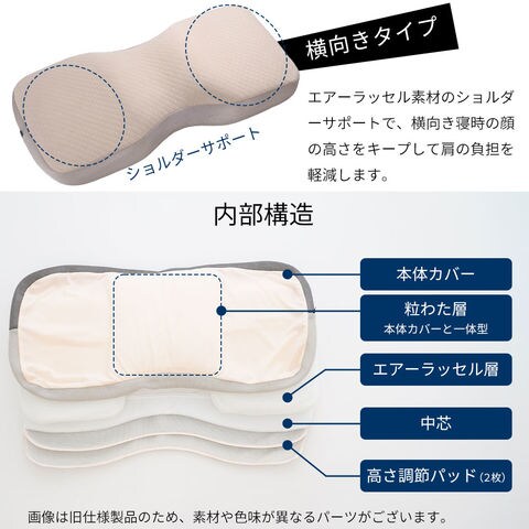 | [仰向けタイプ] 中袋:ポリエステル100% 中綿:ポリエステル100% (粒綿) 中芯・高さ調整パッド:ポリエステル100% [横向きタイプ] 中綿:ポリエステル100% (粒綿) 中芯・高さ調整パッド:ポリエステル100% |