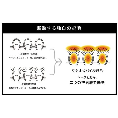 1970年誕生の特許製法「鷲尾式起毛」は特殊ブラシをもちいてループ形状を残したままむらなく起毛し、ソフトでボリューム感のある生地を生み出す円筒起毛です。