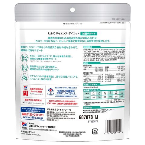 ヒルズ独自の低カロリーレシピ(当社「アダルトチキン成猫用」ドライ製品と比較してカロリー約17%オフ)で健康的な減量と体重管理をサポート。健康な代謝のための高品質な食材の組み合わせ