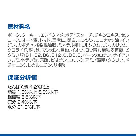 たんぱく質4.2%以上、脂質1.0%以上5.0%以下、粗繊維6.5%以下、灰分2.4%以下、水分81.0%以下