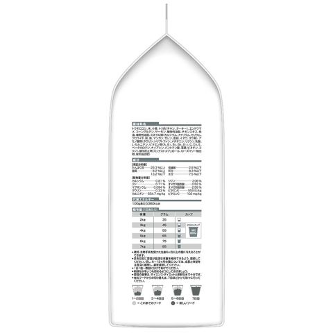 2kg35g、3kg45g、4kg55g、5kg65g、6kg75g、7kg85g(200ccカップ1杯で約85g)