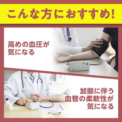 「高めの血圧対策」は、機能性関与成分[γ-アミノ酪酸(ギャバ)]と[カツオ由来エラスチンペプチド]を配合した機能性表示食品です。血圧が高めの方の高めの血圧を下げる機能、加齢とともに低下する血管の柔軟性(血管を締め付けた後の血管の拡張度)を維持する機能が報告されています。