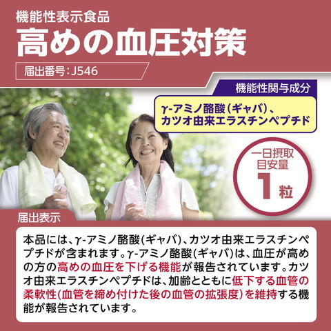 【機能性表示食品】届出番号:J546/機能性関与成分:γ-アミノ酪酸(ギャバ)30mg、カツオ由来エラスチンペプチド75mg/ヘルスクレーム:本品には、γ-アミノ酪酸(ギャバ)、カツオ由来エラスチンペプチドが含まれます。γ-アミノ酪酸(ギャバ)は、血圧が高めの方の高めの血圧を下げる機能が報告されています。カツオ由来エラスチンペプチドは、加齢とともに低下する血管の柔軟性(血管を締め付けた後の血管の拡張度)を維持する機能が報告されています。※本品は、事業者の責任において特定の保健の目的が期待できる旨を表示するものとして、消費者庁長官に届出されたものです。ただし、特定保健用食品と異なり、消費者庁長官による個別審査を受けたものではありません。