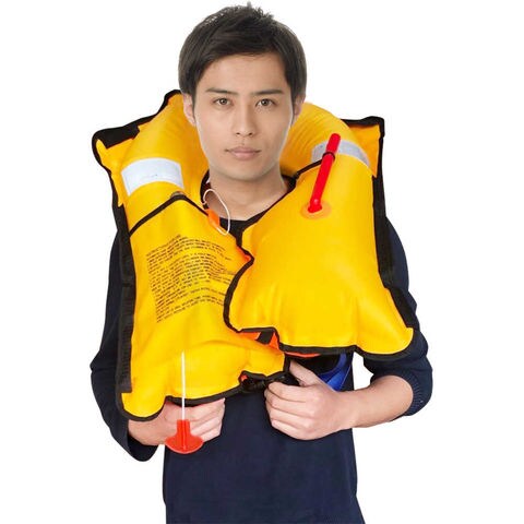 ●万一、自動膨張システムが作動しなかった時は口から呼気で膨張可能。●本製品は主として防災/レジャー用途としてのライフジャケットで、桜マークの型式承認品ではありません。